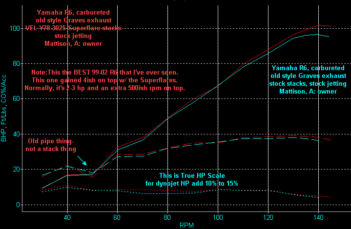 I wouldn't expect that much HP improvement with the Superflare stacks on every bike (as I haven't ever seen it again) - I'd be expecting about 2-3 better on top - with better throttle response everywhere else. The dip at 5,000 rpm was caused by the old style pipe that was on the bike. Normally, with most other or newer pipes, 5,000 rpm is pretty good on an R6.