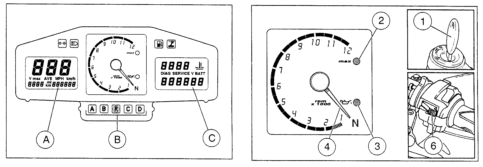 Resetting the average speed (5) and the distance "trip 2" (6): with the odometer set on the "AVS" function, press and hold the pushbutton "R" (B) for about one second.