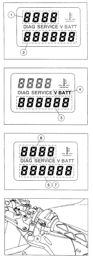 After the first 1000 km (625 mi), and successively every 7500 km (4687 mi), the writing "SERVICE" (5a) appears on the right side display.